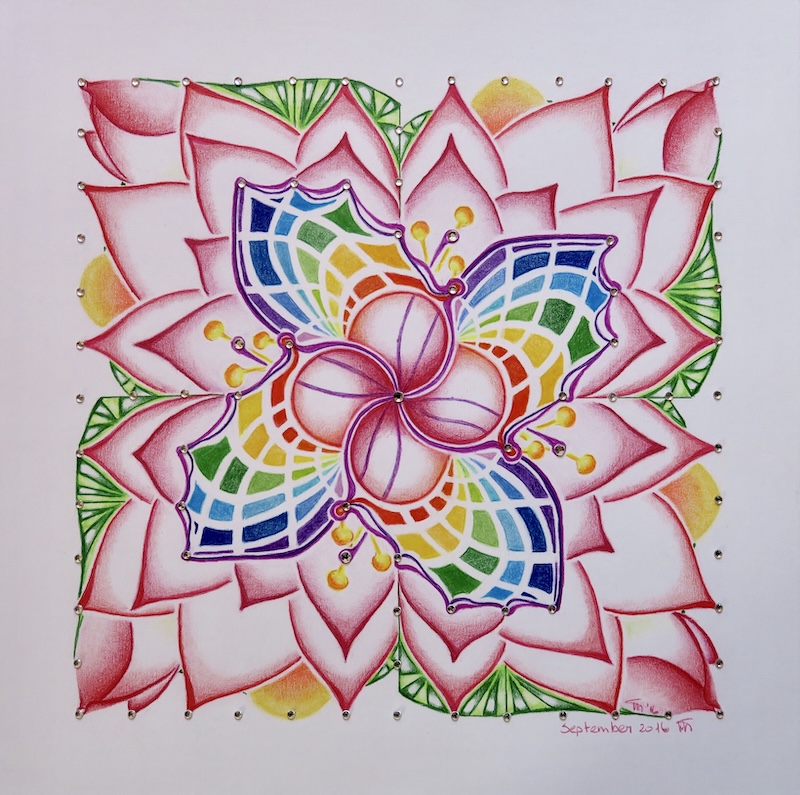 Ik heb de eerste keer tamelijk intuïtief voor de cursus Kolam Tekenen gekozen. Waarschijnlijk heb ik er de eerste keer voor gekozen omdat ik van structuur hou. Marianne neemt je stap voor stap mee. Ik vond het fijn om de rand te ontwerpen en het inkleuren van tekening en rand was een ontspannende bezigheid met mooi resultaat, vooral van het ‘ademend’ kleuren. Met de tekening was ik heel blij. Zie de foto. Terugkijkend heb ik ontdekt waarom ik voor een tweede keer de Kolam-cursus gekozen heb: het geeft me van de ene kant een soort houvast: je mag niet van die ene doorlopende lijn afwijken. En van de andere kant is het voor mij een uitdaging, een puzzel, om de door die lijn vormgegeven figuur, en de rand om de figuur, zoveel mogelijk naar mijn eigen hand te zetten en er iets moois van te maken. En het kleuren met de kleurpotloden is heel ontspannend om te doen. Anders gezegd: Als je onder bezielende, stimulerende begeleiding van puzzelen met lijn en kleuren houdt, is de Kolam-cursus bij Marianne Geerts een aanrader!